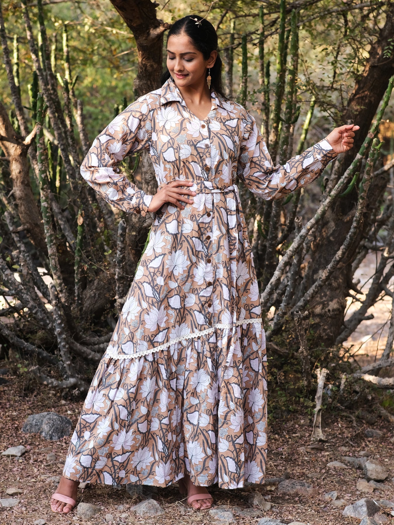 This maxi dress boasts a collar and front button closure along with a long sleeve design and front slit. Made from cotton fabric, it showcases a traditional Indian handblock print that highlights India's rich heritage. The printed design is both elegant and charming, featuring a v-neckline and 3/4th sleeves. This stylish and comfy dress is perfect for any occasion and a must-have for your fashion-forward wardrobe!