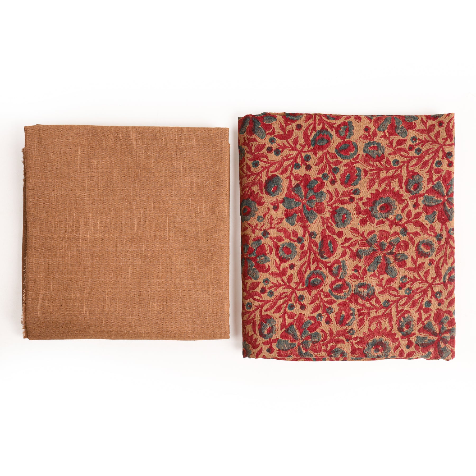 Handblock Floral Kurti & Solid Pant Fabric Set – Brown Cotton